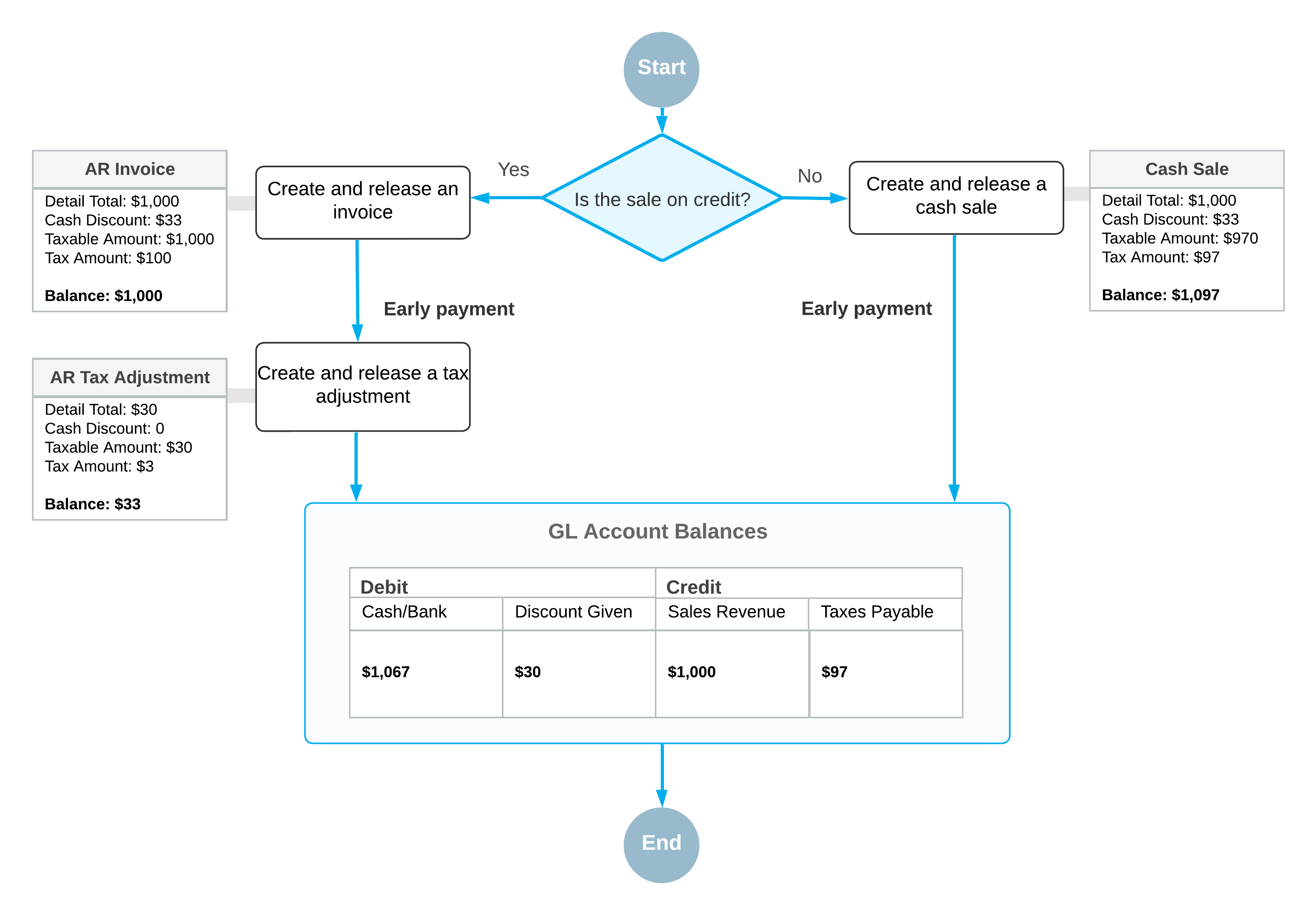 For documents (cash sales, cash returns, and cash purchases) that record payments made immediately, the GL accounts involved in the transaction (the tax, discount, and cash accounts) are adjusted at the beginning with the discount percent. The following diagram illustrates how the system applies discounts to AR invoices (by creating a credit memo) and to cash sale documents (by adjusting the amounts immediately). In either case, the resulting balances of GL accounts are the same.