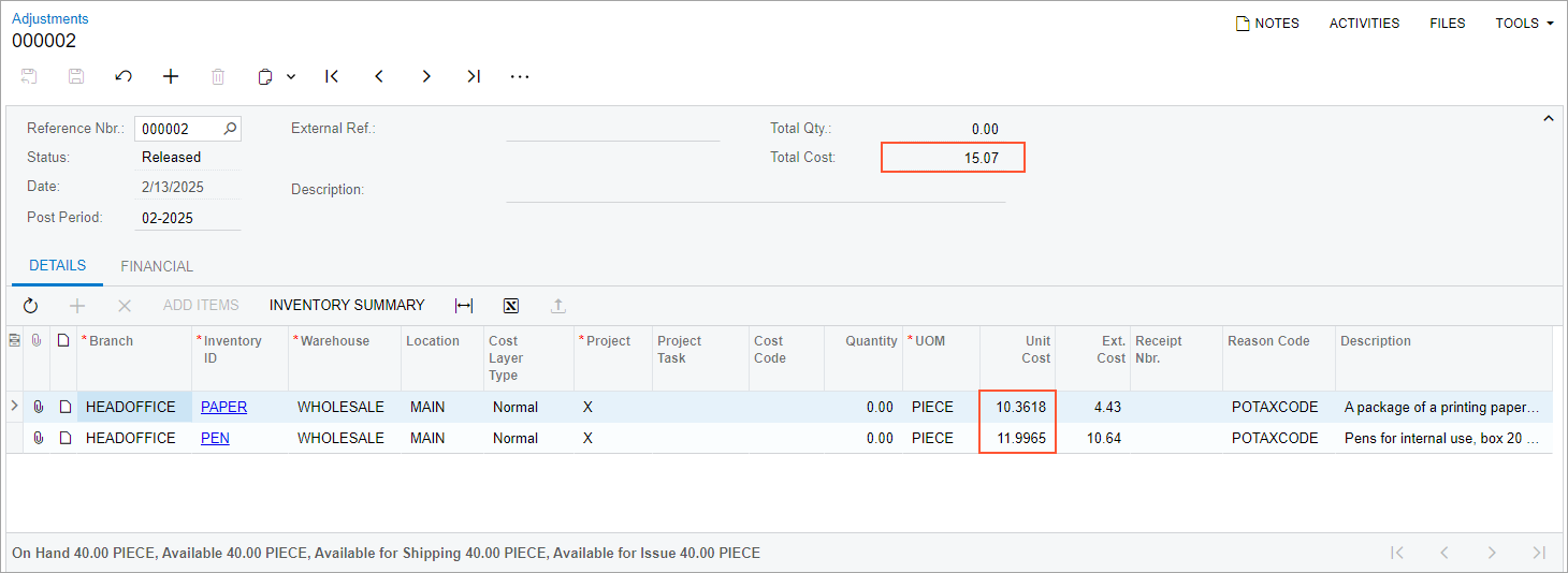 - On the Stock Items (IN202500) form, the PAPER and PEN stock items have been configured.