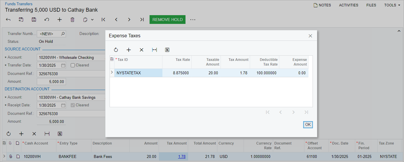 In this activity, you will first modify the settings of the 10200WH cash account on the Cash Accounts (CA202000) form by adding the tax zone to the BANKFEE entry type of this cash account. Then on the Funds Transfers (CA301000) form, you will record a funds transfer in the amount of $5,000 from the 10200WH cash account to the 10300WH cash account. On the form table, you will add a bank fee for this transfer and specify the tax zone and tax category for this line. You will then open the Expense Taxes dialog box to review the tax that has been automatically applied by the system to this expense line.