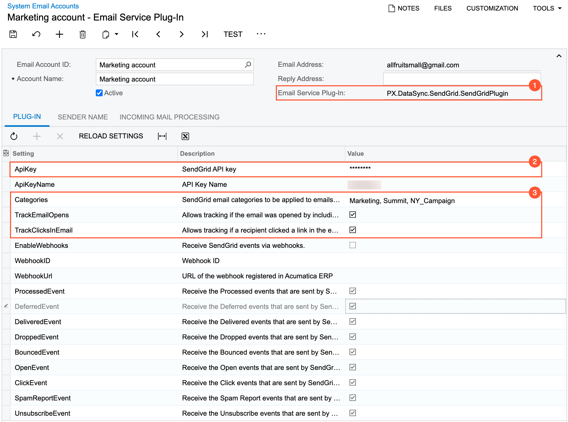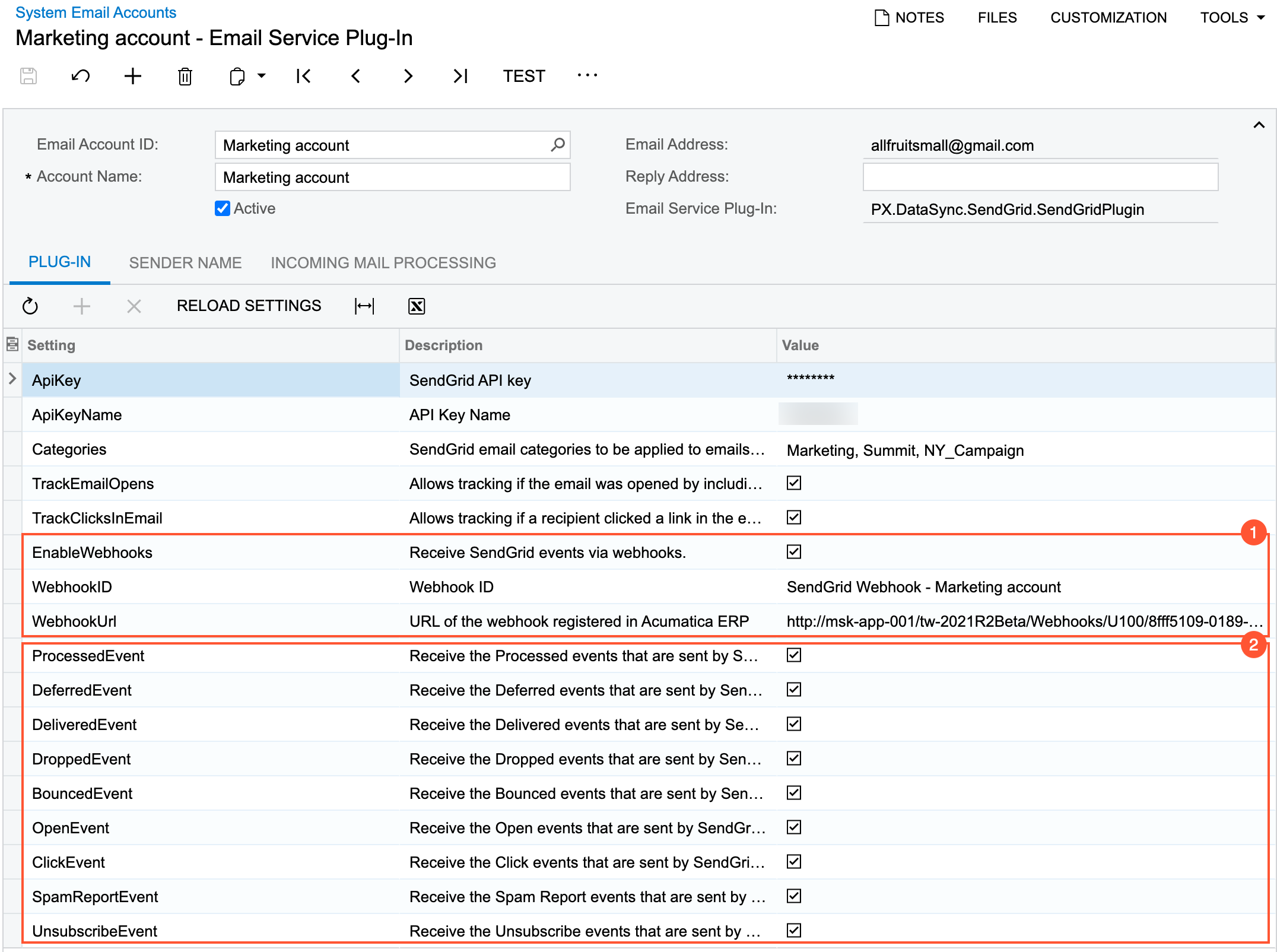 On the Email Accounts (SM204002) form, for the corresponding system email account, you enable the receipt of information from SendGrid by selecting the check box in the EnableWebhooks row on the Plug-In tab of the form (see Item 1 the following screenshot).