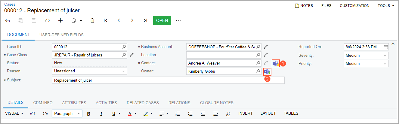 If a contact or employee that is selected in one of the applicable boxes on a supported form is a member of a Teams channel, MYOB Acumatica displays the Teams icon to the right of this box. The following screenshot shows the Cases (CR306000) form with the Teams icons to the right of the Contact box (see Item 1 in the screenshot) and the Owner box (Item 2).