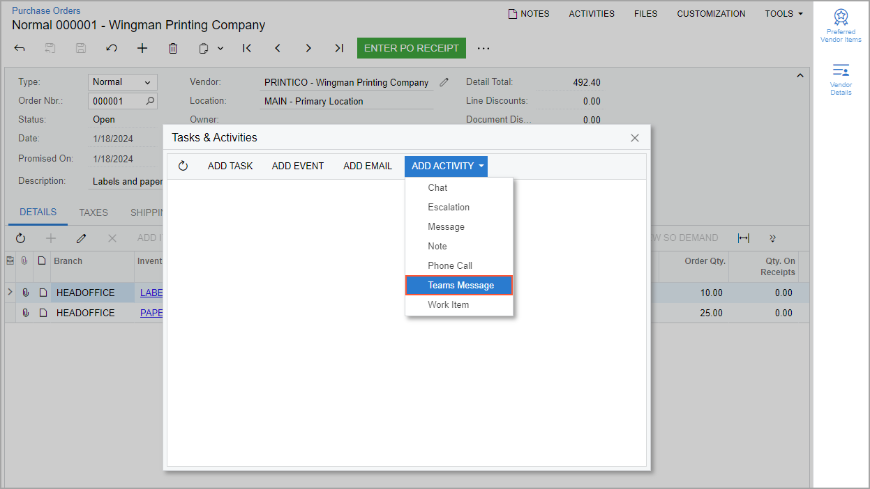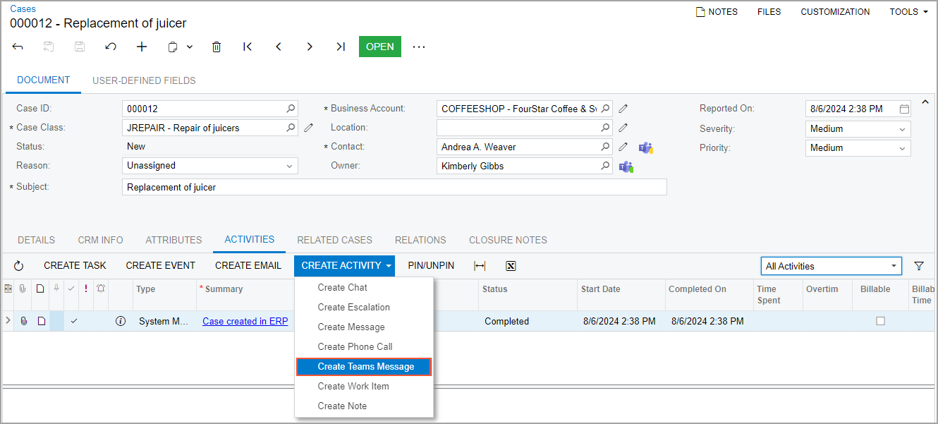 Before you can share MYOB Acumatica records through Teams, you need to add a new activity type on the Activity Types (CR102000) form. A user selects this activity type to send a link to a record to a Teams channel or a Teams member. The menu commands that correspond to the created activity type then appear on the appropriate parts of the forms as follows[2]Notes: You share Acumatica ERP records through Teams by using the Activities tab on the forms that have this tab, and in the Tasks & Activities dialog box on form that do not have this tab. This activity is required to share documents with a Teams member or channel. After you add this activity type, a new command will appear on the Activities tabs of Acumatica ERP form (for forms that have this tab), or on the Add Activity menu of the Tasks & Activities dialog box (for forms that do not have this tab).2023/03/1722:30:08+03:00: