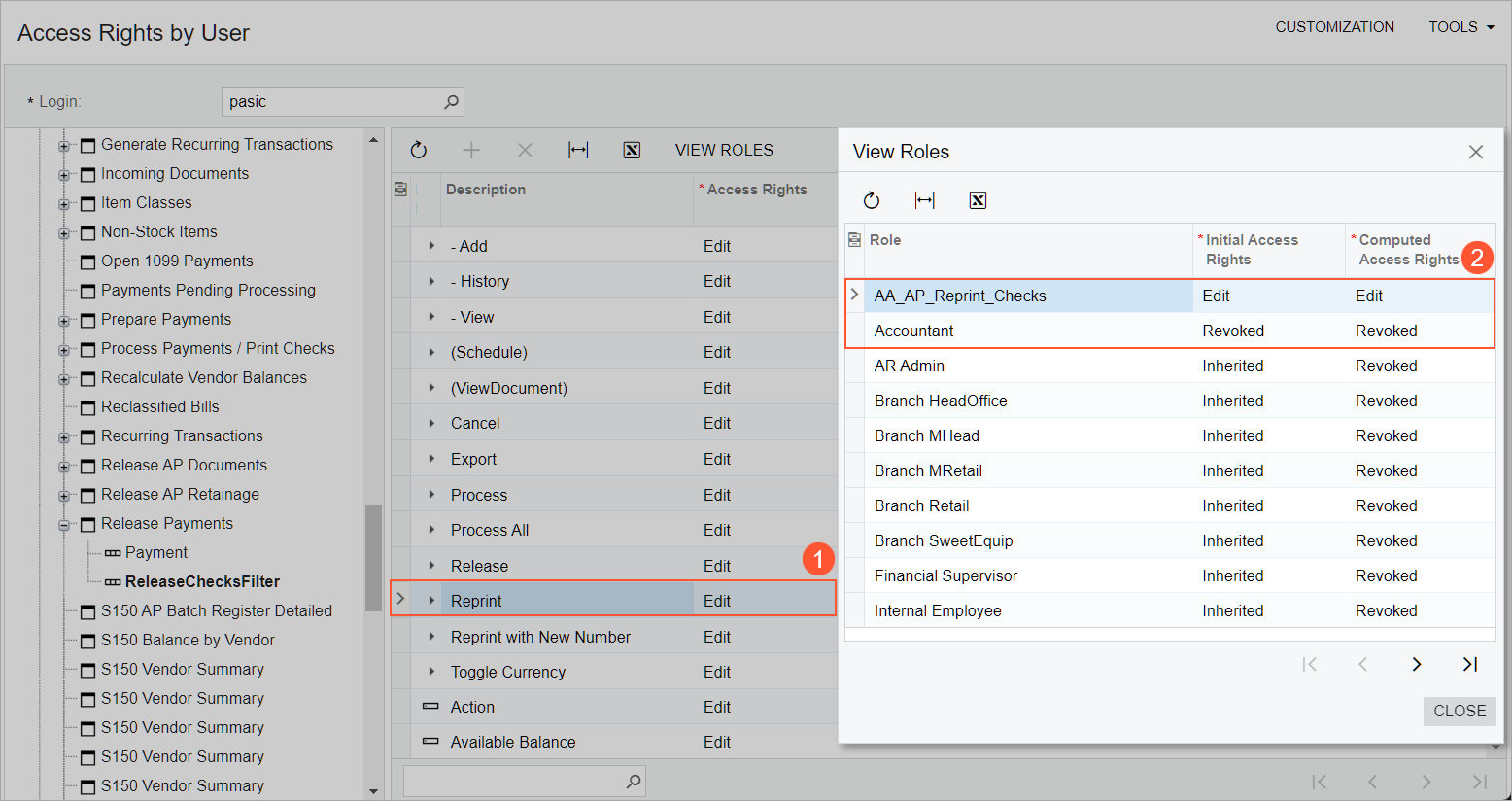 - In the Access Rights column, select Revoked for the AA_AP_Reprint_Checks role.