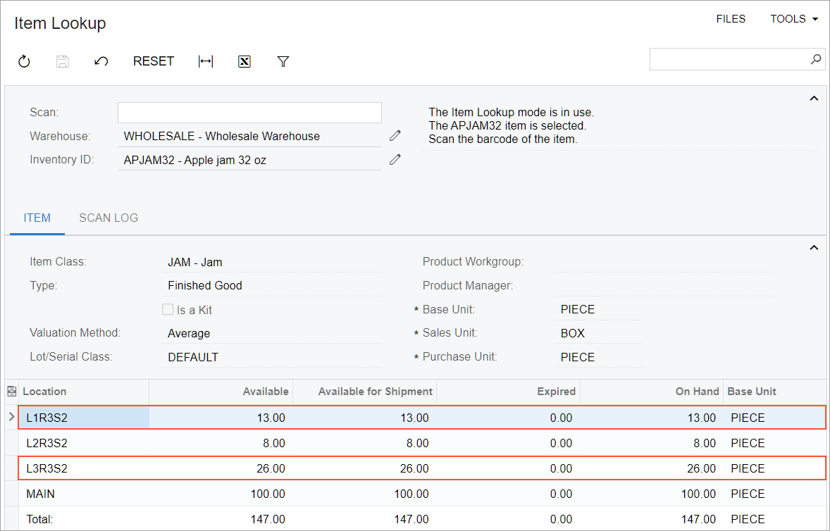 - In the Scan box, type AJ32B, which is the barcode affixed to the box you found, and press Enter. Notice that APJAM32 item (for which this barcode is specified in the item settings) is shown in the Inventory ID box.