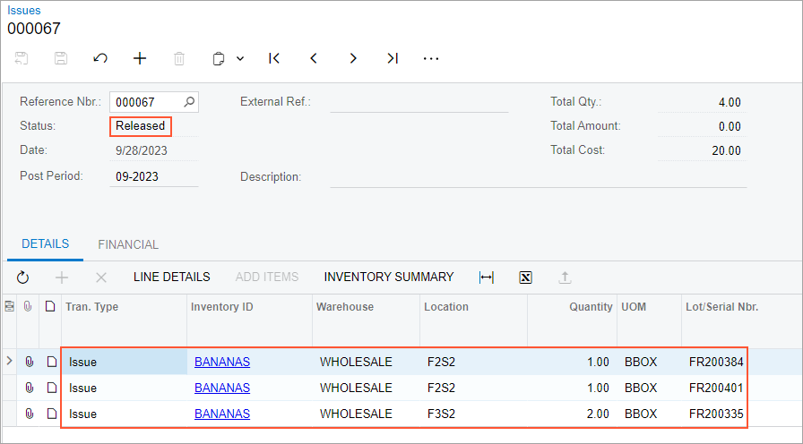Inventory ID Lot/Serial Nbr. Expiration Date Location Quantity UOM BANANAS FR200384 2/3/2025 F2S2 1 BBOX BANANAS FR200401 2/6/2025 F2S2 1 BBOX BANANAS FR200335 2/4/2025 F3S2 2 BBOX - On the form toolbar, click Release to release the inventory issue.