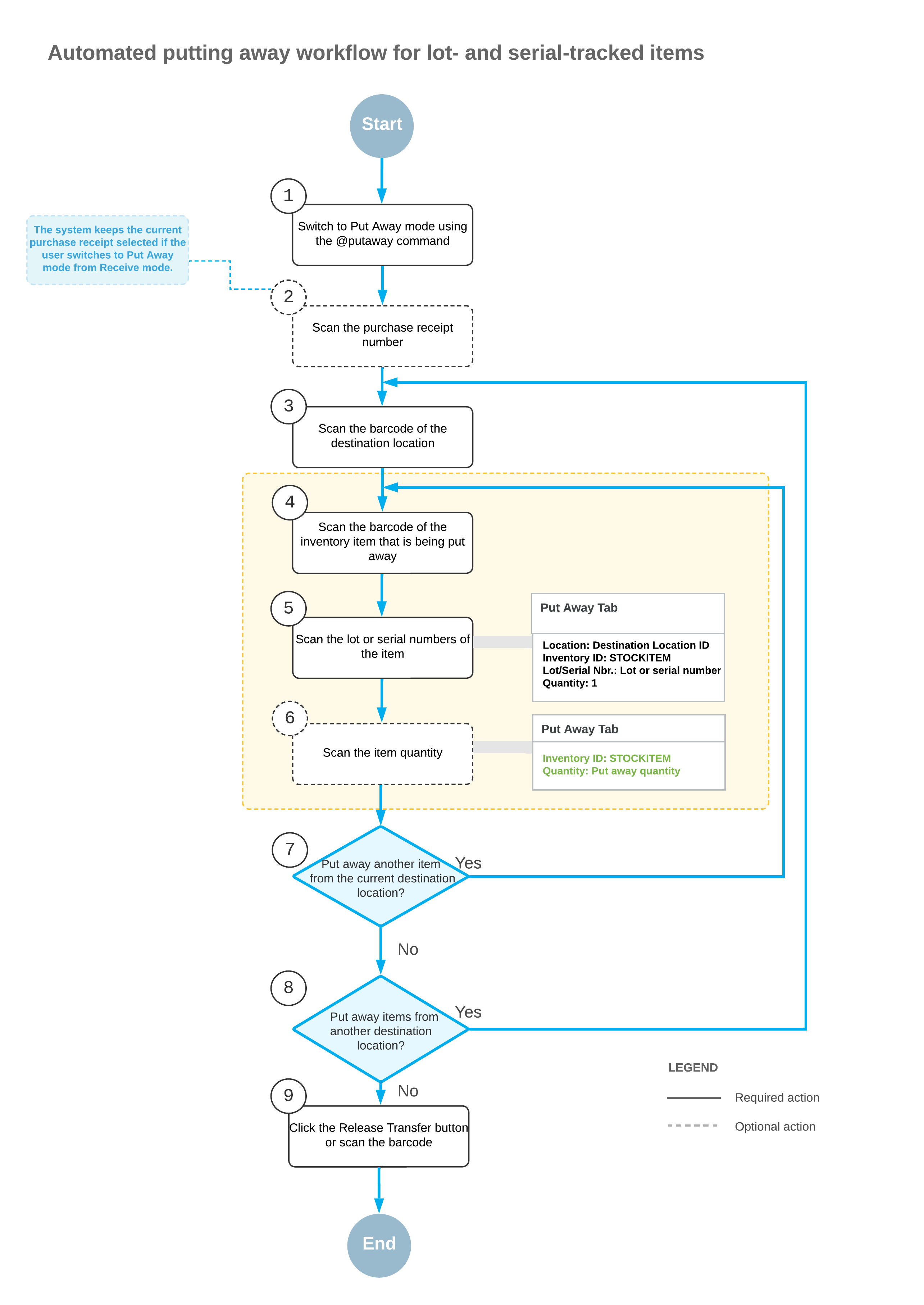 In this topic, you will read about the workflow for the automated receiving and putting away of lot- and serial-tracked inventory items in MYOB Acumatica. The workflow in this topic is based on the assumption that your system has the recommended configuration described in Automated Operations with Lot- and Serial-Tracked Items: Implementation Checklist.