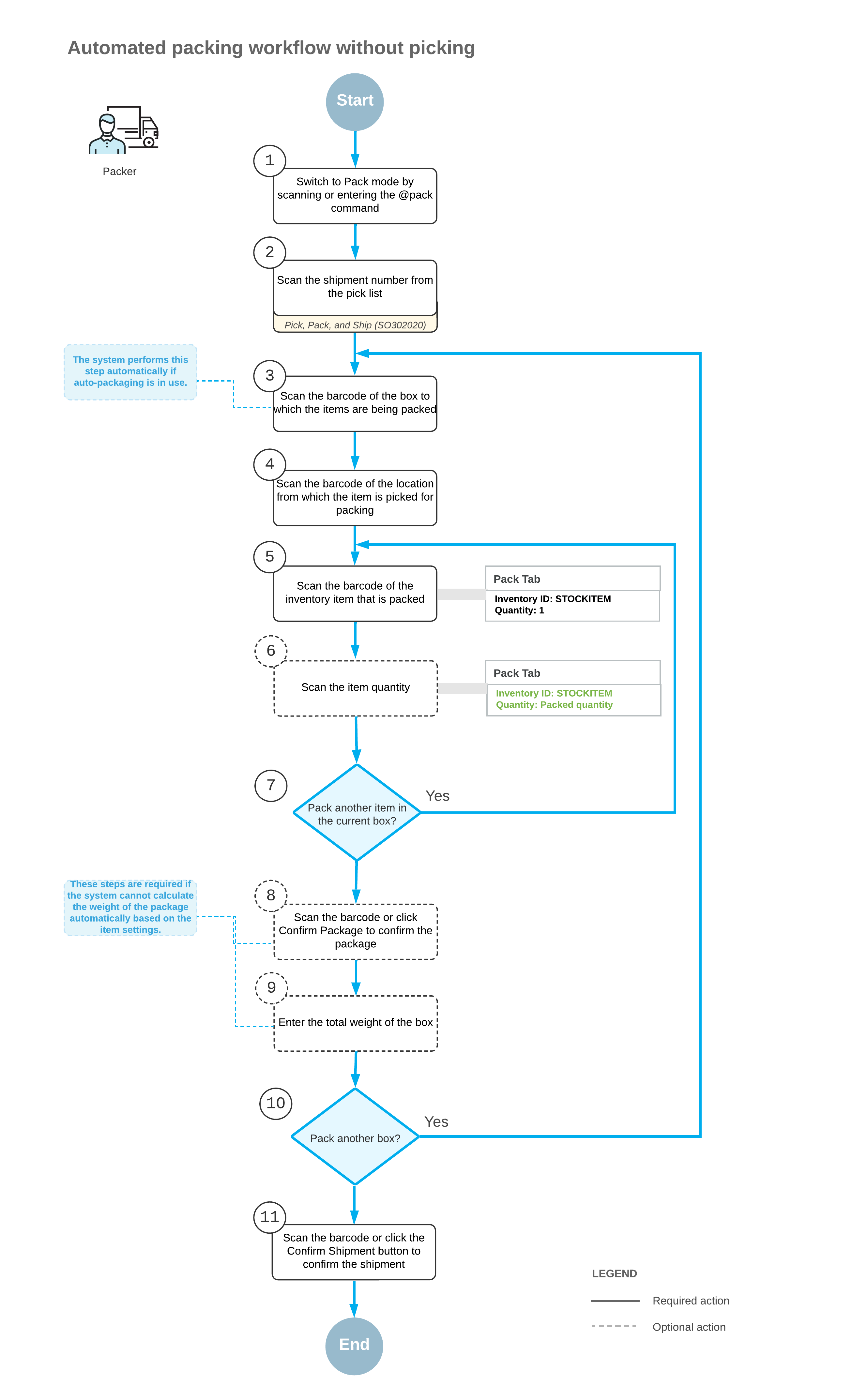 In this topic, you will read about the workflow for the automated packing of inventory items in MYOB Acumatica. The workflow in this topic is based on the assumption that your system has the recommended configuration described in Packing Operations: Implementation Checklist.