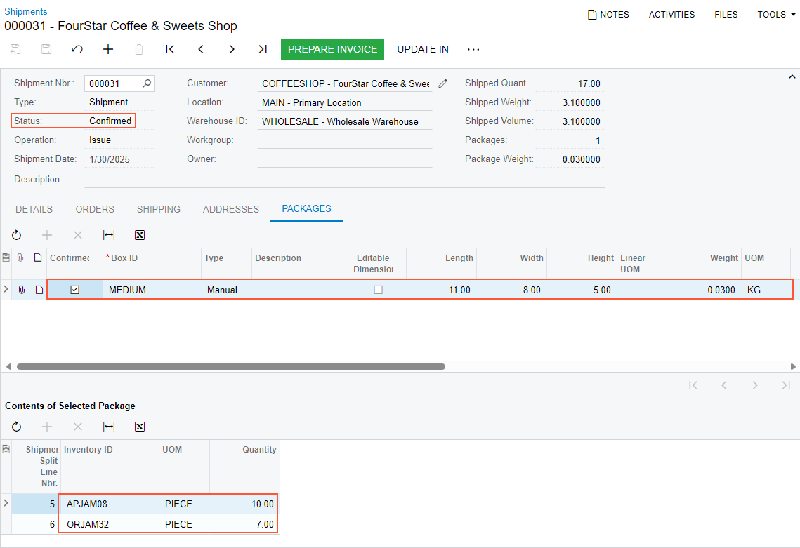 - On the Shipments (SO302000) form, the 000031 shipment has been created for this sales order.