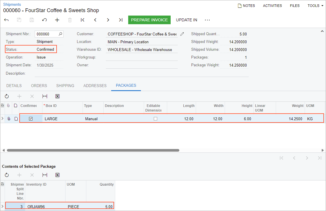 - Acting as a packer, you will pack one of the shipments of the wave by using the Pick, Pack, and Ship form and review the confirmed shipment on the Shipments (SO302000) form.