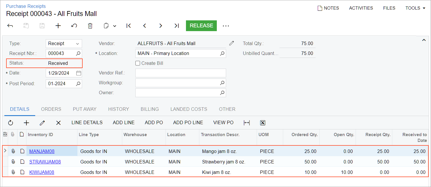 Further suppose that the warehouse worker has received the purchased mango and strawberry jams at the receiving location of the warehouse, but no kiwi jam has been delivered. The worker leaves its quantity as 0 and confirms the receipt of the items. The warehouse manager verifies the correctness of item quantities, corrects some mistakes, and releases the receipt.