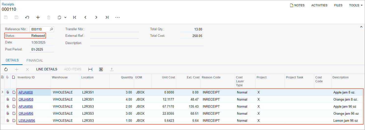 You have successfully created and released the inventory receipt to record the addition or received jam to the warehouse locations.