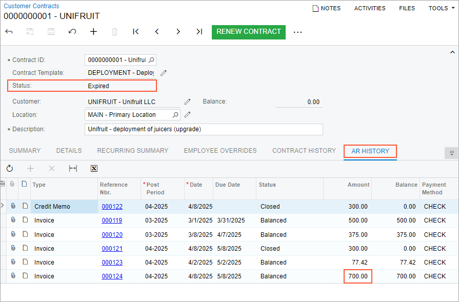 - Notice that the contract now has the Expired status, and no invoice has