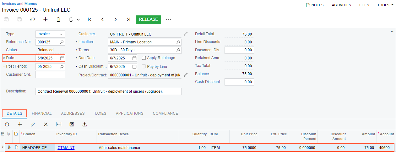 In the invoice, the CTMAINT non-stock item is listed on the Details tab, because this non-stock item has been specified as a renewal item on the Price Options tab of the Contract Items (CT201000) form (Setup and Renewal section). The unit price for the CI00000001 (Deployment of juicers) contract item is calculated as 15% of the setup item price ($500 * 0.15 = $75). The invoice date (5/8/2025) matches the date of the contract renewal.