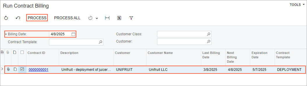 - On the Customer Contracts (CT301000) form, open the 0000000001 (Unifruit - deployment of juicers (upgrade)) contract. Notice the next billing date (5/7/2025) in the Next Billing Date box on the Summary tab.