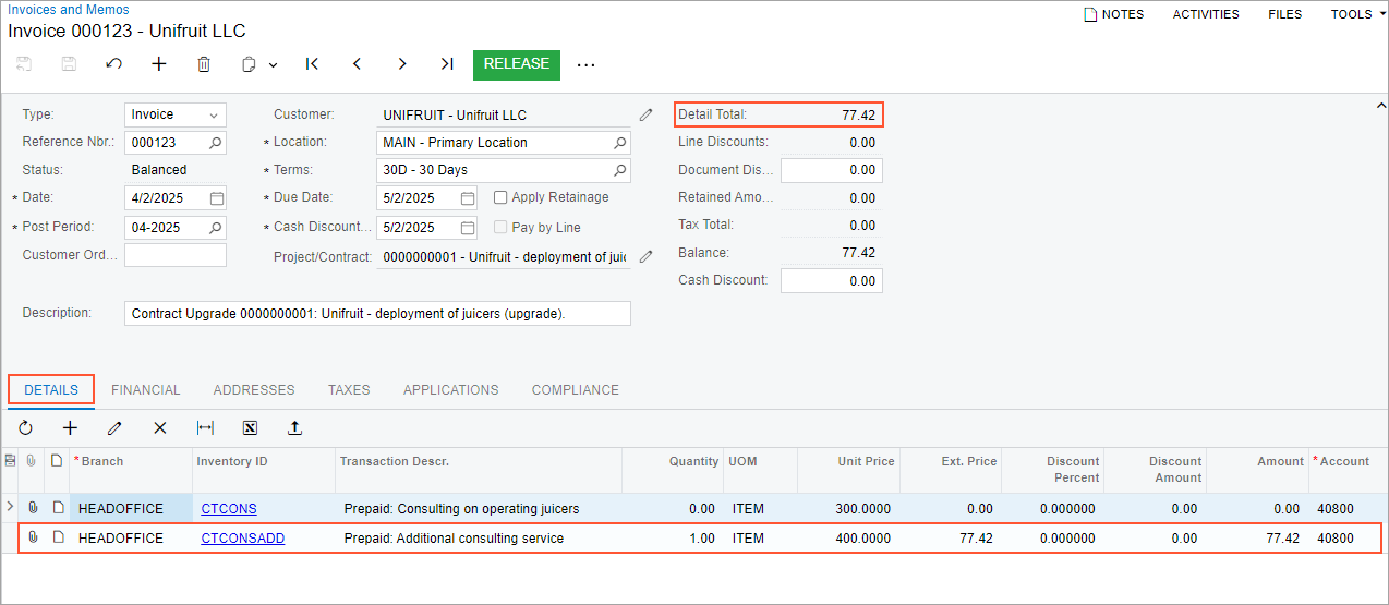 The details of this invoice (see the screenshot below) include a newly added service in the amount of $400. In the Summary area of the invoice, review the value in the Detail Total box, which is $77.42 because the company has rendered an additional service to the Unifruit LLC customer from 4/2/2025 through 4/8/2025 after activation of the upgrade.
