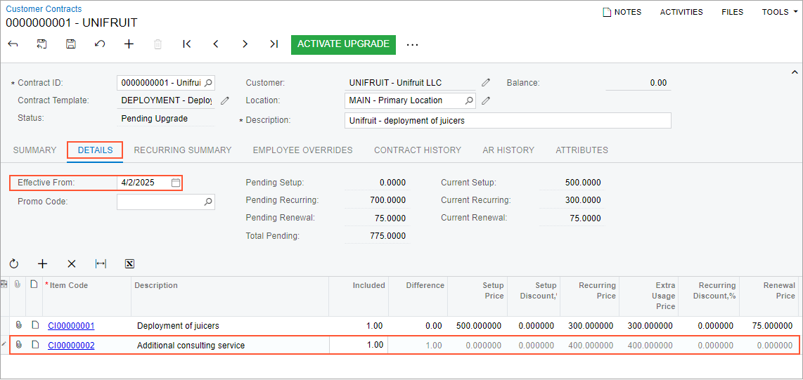 - On the Customer Contracts (CT301000) form, open the 0000000001 (Unifruit - Deployment of juicers) contract.
