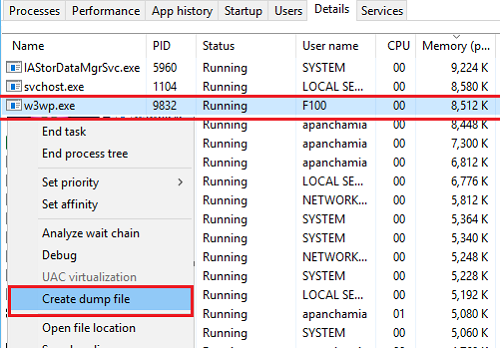 - In Task Manager on the application server, find the w3wp.exe process that is run under the username that is the name of the application pool.