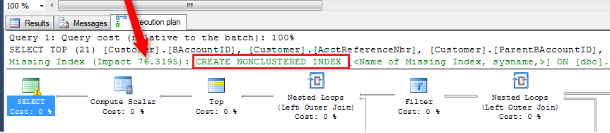 provided by the SQL Server.The following screenshot demonstrates SQL Server suggesting that the problem is a missing index.