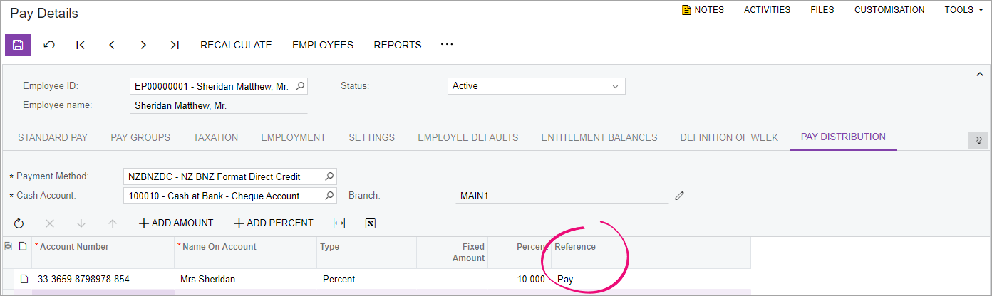 In the Pay Distribution tab, complete the Reference field, which is required to appear on your employee's bank statement. This is usually the company name and salary, but it can be any detail that your employee would like to see.
