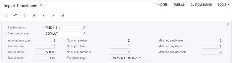 The summary area of the Import Timesheets form (MP.PP.70.30) provides an overview of the imported record set. Use these totals to confirm that all timesheet records have been imported and mapped correctly by, for example: