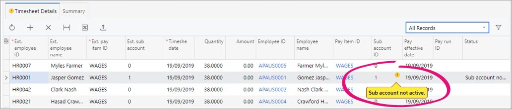 If a timesheet record has missing or incorrect information, a warning appears in the affected field. The Status column also details the problem. For example, the screenshot below shows a warning about an inactive subaccount. To only show records with warnings, you can filter the Status column by “Is Not Null”.