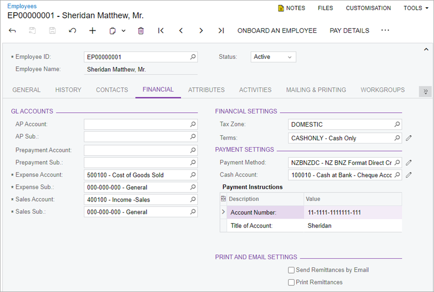 In the Payment Settings section, add the employee's bank details, account number and account name.